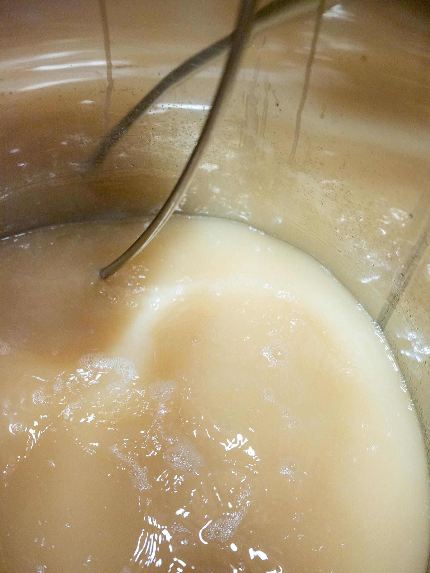 Das tägliche Umwälzen (Belüften) des gärenden Mosts kann ebenfalls nicht mit Pumpen erfolgen, sondern nur durch Unterstoßen, wie es Sofia auf dem Foto tut.