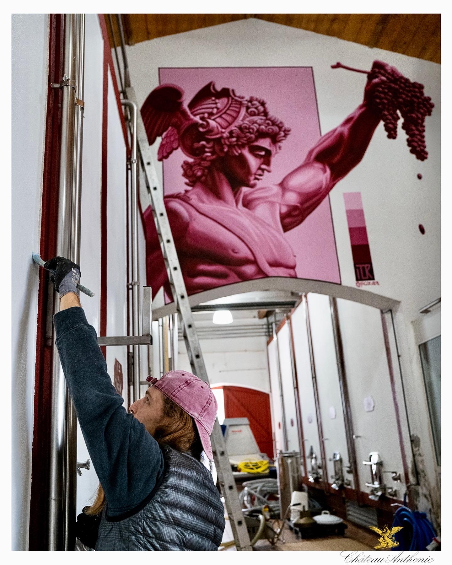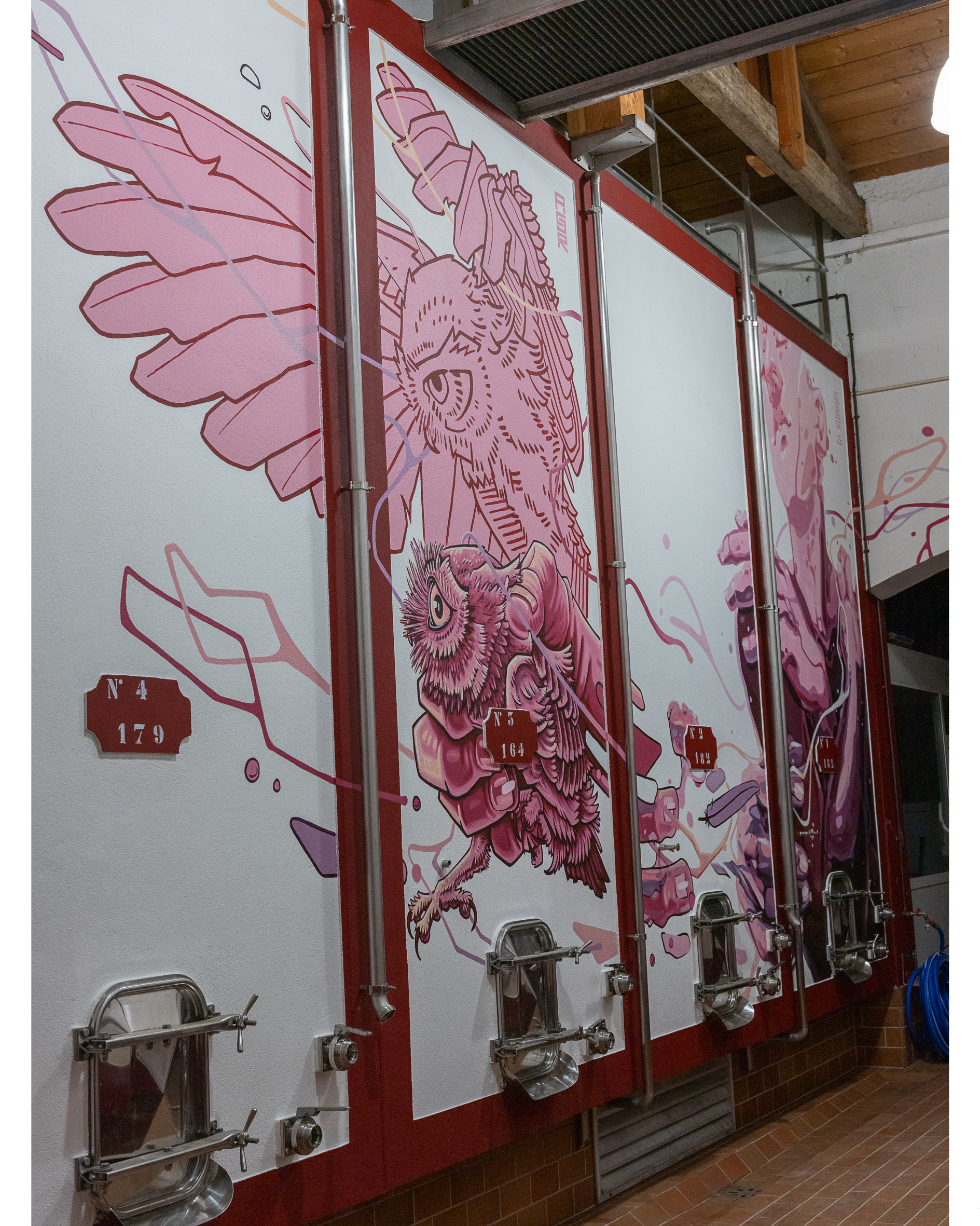 Sofia & Lucia füllen unsere Weine unter den komplizenhaften Blicken der Figuren auf dem von den Künstlern Mosh & Picor geschaffenen Fresko ab.