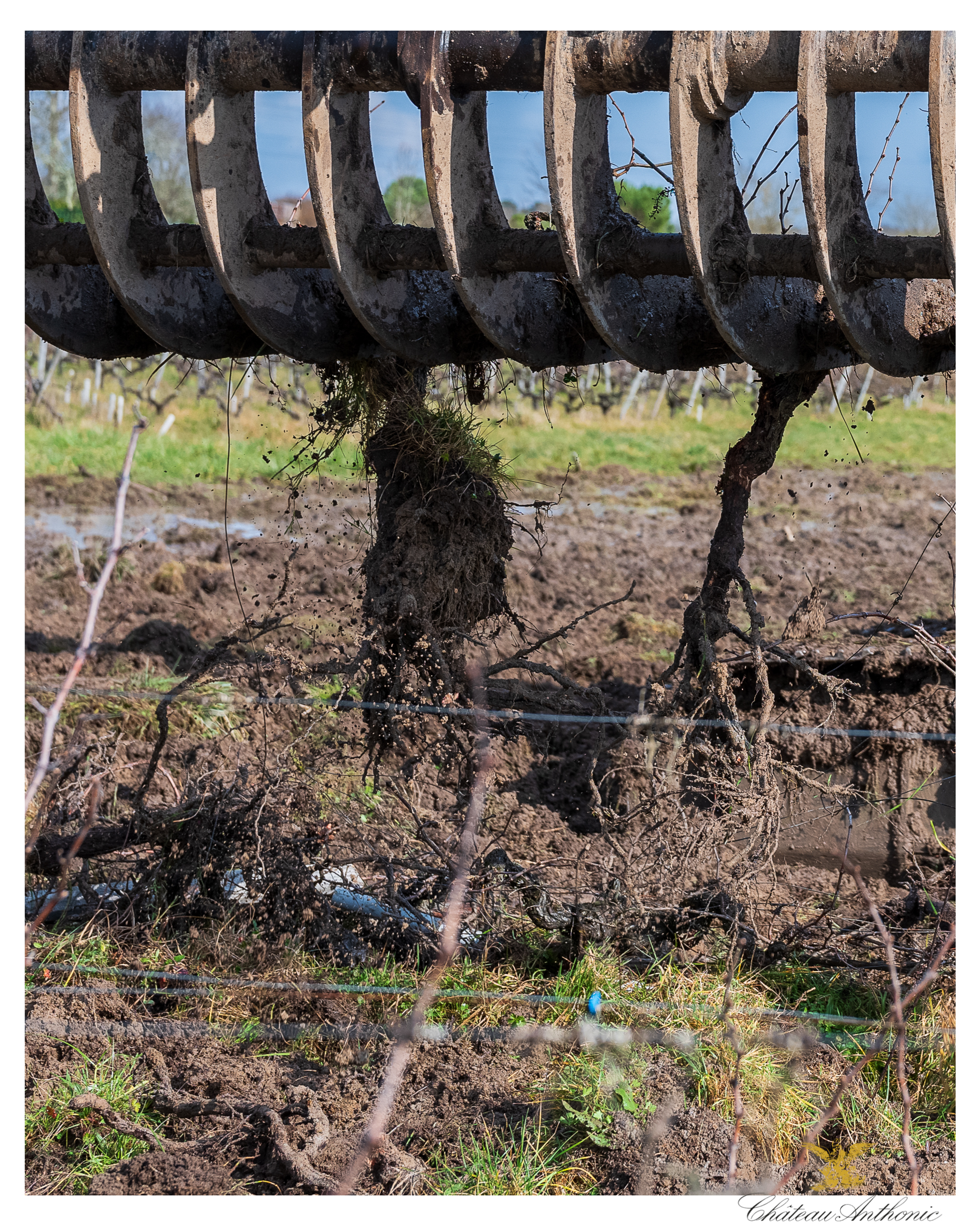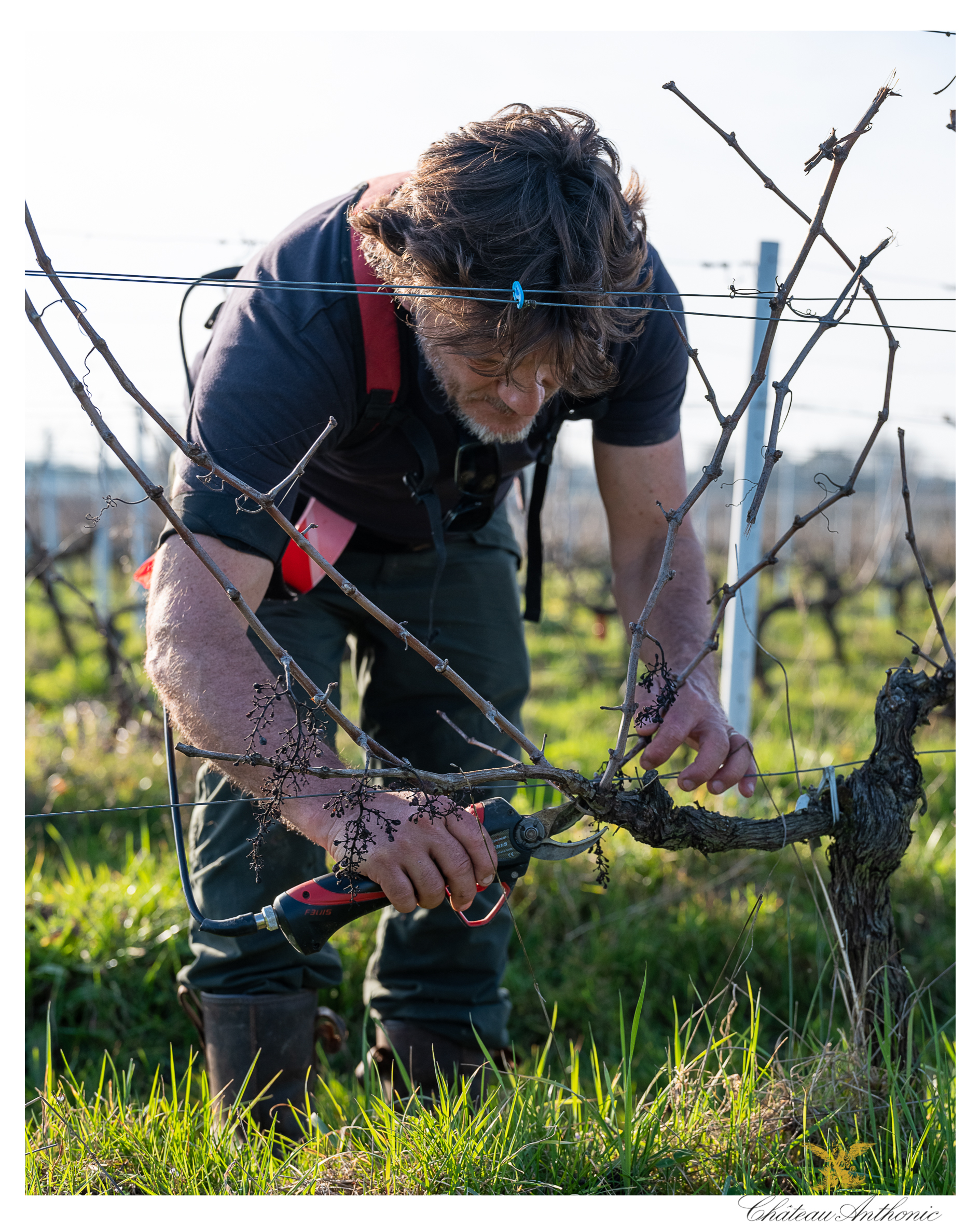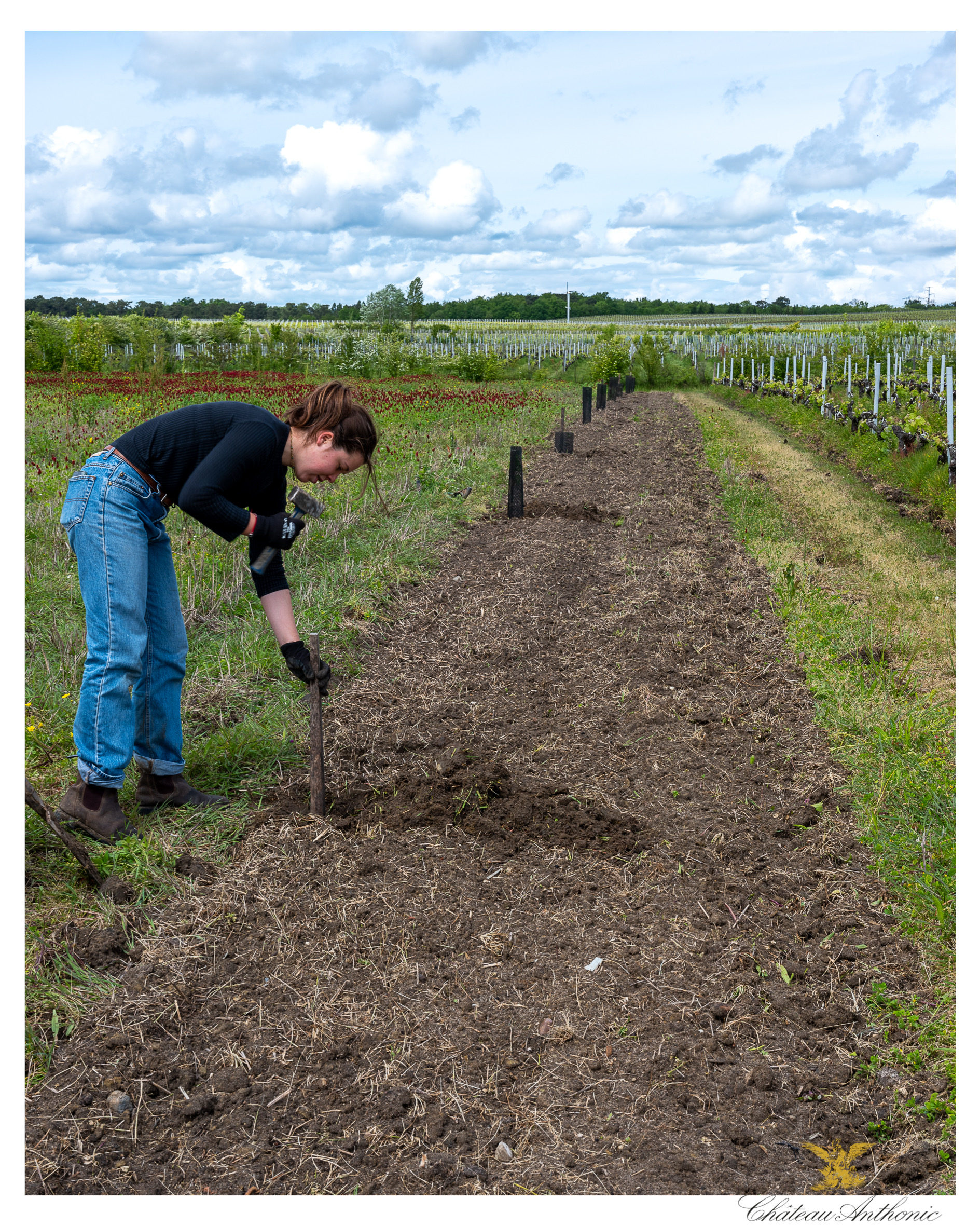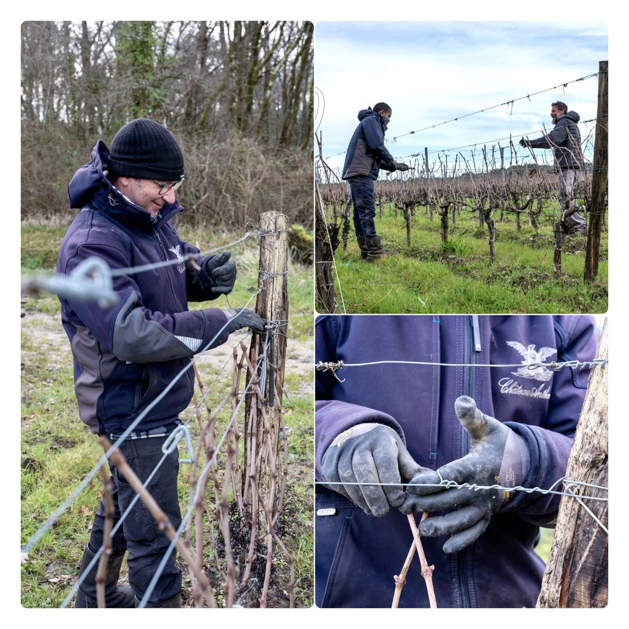 Philippe hebt die Drähte in dieser Parzelle an, in der wir Merlot-Pflanzen auf Bouysselet veredelt haben.